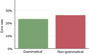 To show that people not only recognize this structure, but also represent it concretely in their brain, we used a method about which we told you here – syntactic chunking. The participants heard a sequence of non-number words, as the one described above, and then repeated it. The trick was that some sequences were grammatical, i.e., the series of nonwords were structured in a number-like manner (e.g., “kamak hundred, palirty-bab”), whereas other sequences contained precisely the same words but in a different order, such that the sequence was not grammatical (“bab, palirty, kamak hundred”). If the participants represent the syntactic structure of the number-like sequence, in spite of it having no numerical meaning, they would represent the two sequences above in two very different ways: they will perceive the non-grammatical sequence as a series of independent words, but they would be able to perceive the grammatical sequence as a single unit, a multi-digit number-like thing, rather than as a series of words. Cognitive researchers of memory call this phenomenon chunking, because the participants “pack” several words into a single chunk in memory; and we know that chunking improves the performance in memory tasks. In short, if the participants represent the numbers’ syntactic structure, they should remember the grammatical sequences better than the non-grammatical ones. And this was precisely the case: